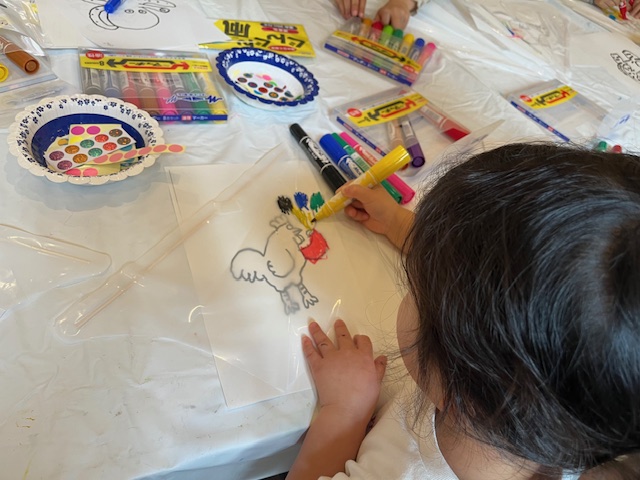 高畠純さんのかわいい動物の下絵を写すもよし、好きな絵を描くのもよし、カイトに思い思いの絵を描きました。