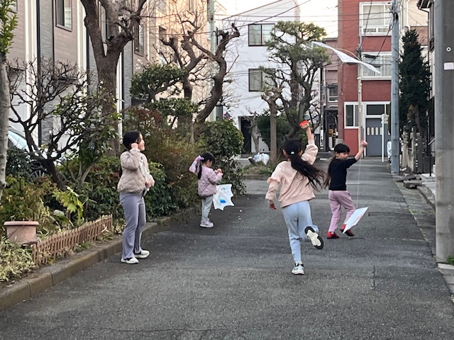 店の前の道路で、早速凧揚げをする子も! 電線があるので、あまり高くあげることはできませんでしたが、凧揚げを楽しんでいました。