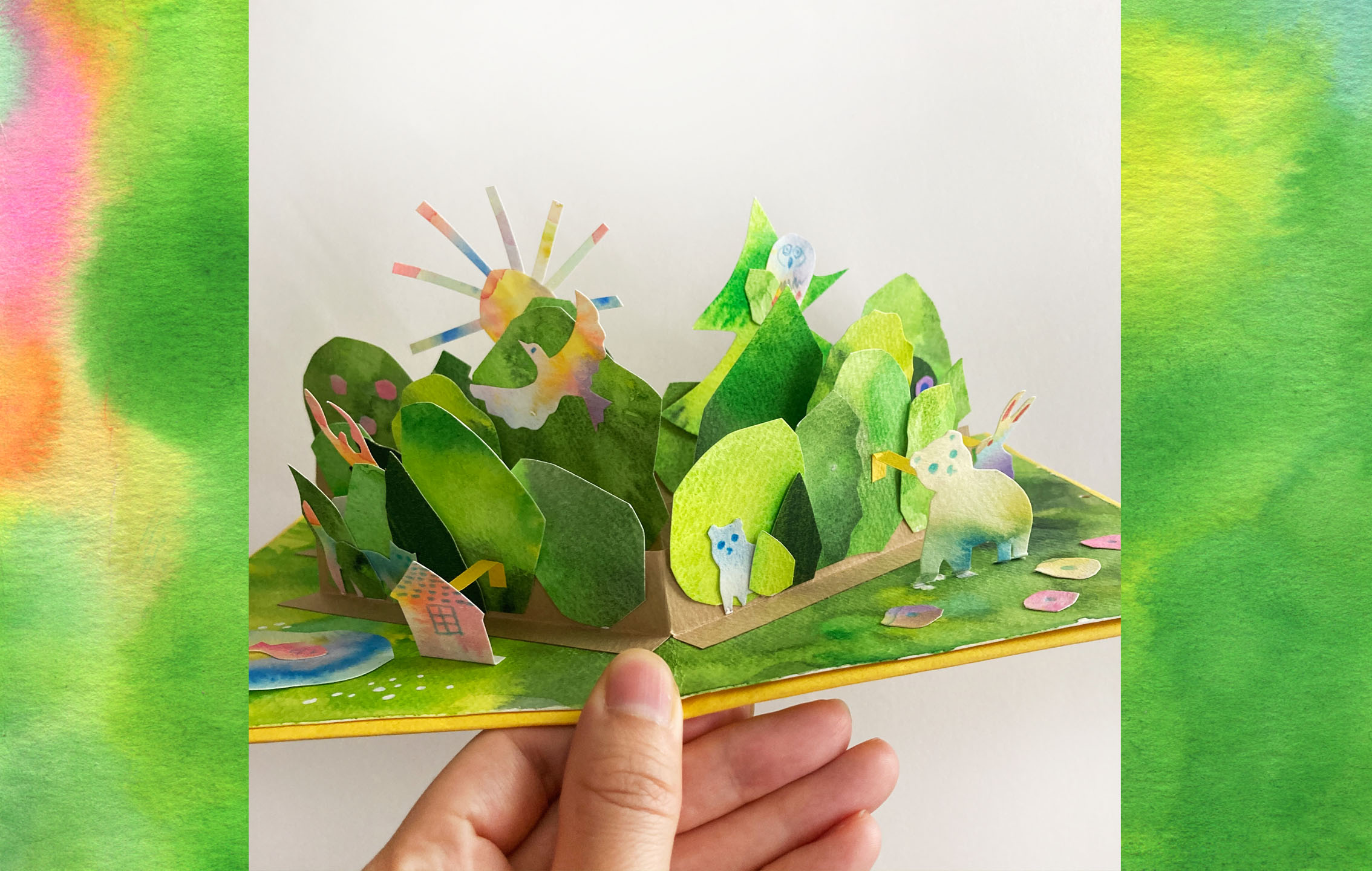 水彩絵の具とはさみを使って、カードを広げると元気に飛び出すちいさな森を作りましょう!